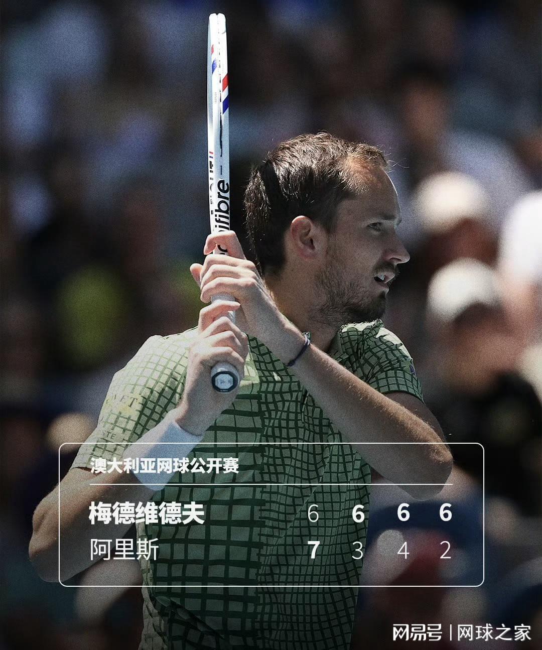 1月21日,三届澳网亚军、俄罗斯名将梅德韦杰夫在2026年澳网男单第二轮,面对法国选手阿里斯的强力挑战,在首盘抢七9-11惜败后没有慌乱,以6-3、6-4、6-2连扳三盘,耗时超过三小时完成逆转,职业生涯第七次闯入澳网32强。这场比赛的首盘堪称鏖战,双方战至抢七,梅德韦杰夫在抢七9-8领先...